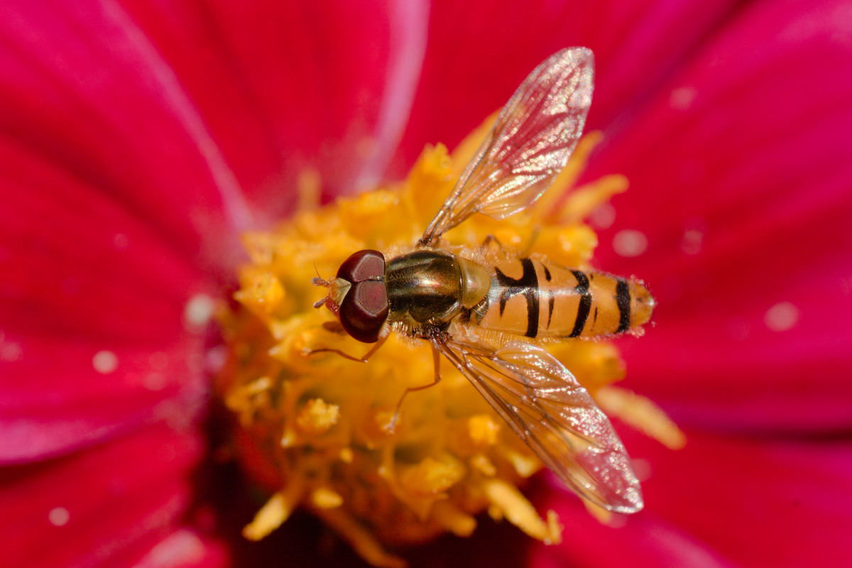 Fliegen (Diptera) bestäuben ebenfalls Blüten. Die einen sind ganz gezielte Blütenbesucher, die anderen holen sich zwischendurch einen Schluck Nektar und bestäuben “nebenbei”. Zu ihnen gehören die Schwebfliegen, die man als Ungeübter leicht mit Wespen oder Bienen verwechseln kann. Durch die sogenannte “Mimikry” geben sie sich für Fressfeinde als gefährliche Stachelträger aus – was gar nicht stimmt! Fliegen haben weder einen Stachel noch einen Saugrüssel wie etwas Mücken. Gerade die Schwebfliegen sind doppelt interessant, weil sie gleich doppelte Nützlinge sind: sie bestäuben und ihre Larven fressen Schädlinge wie z.B. Blattläuse. Es ist also immer gut, seinen Garten attraktiv für Schwebfliegen zu gestalten. Fliegen leisten ihren Bestäubungsdienst oft noch früher im Jahr als Wildbienen und werden umso wichtiger für die Bestäubung von Wildpflanzen, umso höher man kommt (z.B. im Gebirge).
