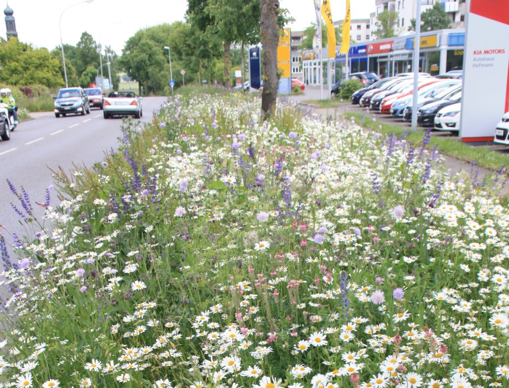 Naturnahes Grünflächenmanagement mit Blumenwiesen als Straßenrand in Bad Saulgau. Foto: Holger Loritz