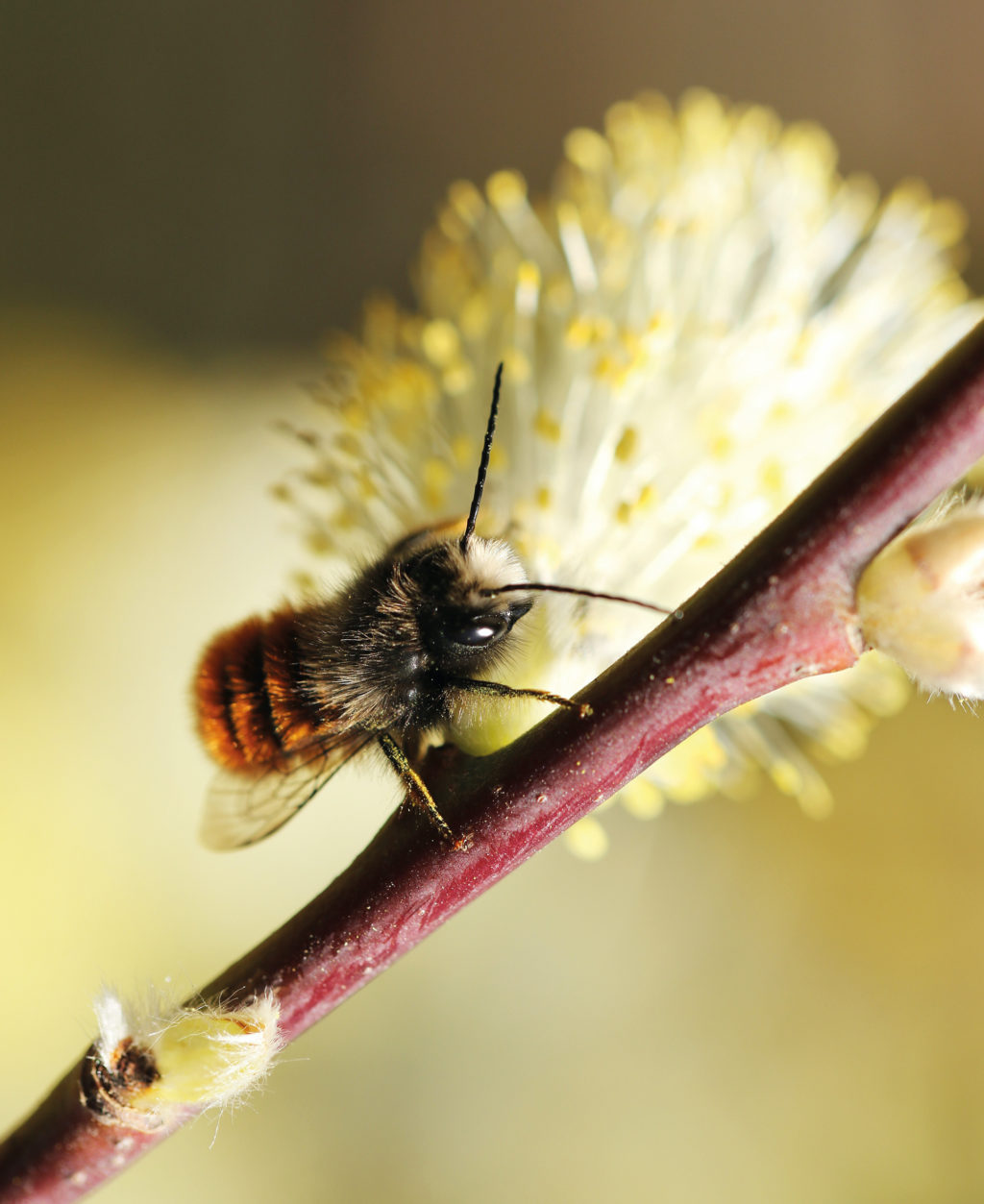 Die Gehörnte Mauerbiene fühlt sich im Siedlungsbereich besonders wohl. Vorausgesetzt, sie findet in den Gärten ein reiches Angebot an früh blühenden Pflanzen und Kräutern. Bereits im späten, milden Februar oder Anfang März beginnt sie ihre Brutzellen anzulegen. Dazu nutzt sie zum Beispiel Löcher oder Ritzen an einer sonnenbeschienenen Hauswand. Stellen wir ihr eine Nisthilfe zur Verfügung, nimmt sie diese ebenfalls gerne an. Hier legt das Weibchen seine Eier ab. Die Larven überwintern in völliger Ruhe, um im kommenden Jahr zu schlüpfen.