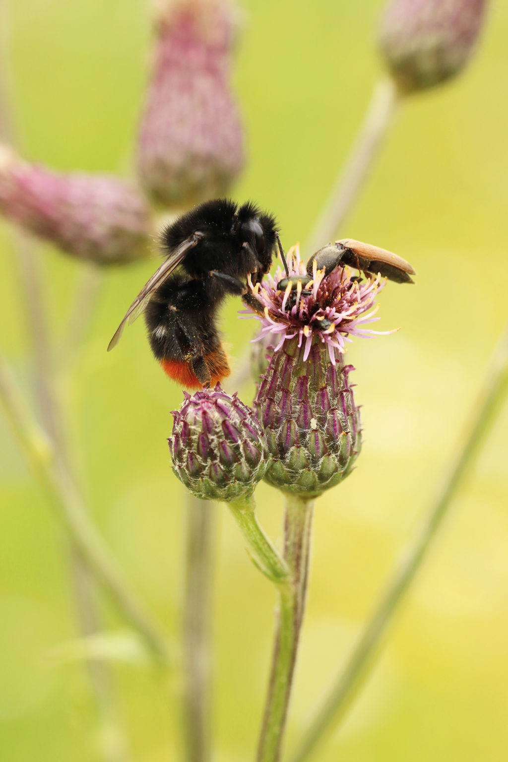 Das Weibchen ist farblich auf Schwarz und Rotbraun reduziert und scheinbar leicht zu bestimmen. Jedoch gibt es elf andere Hummelarten, die ihr zum Verwechseln ähnlich sehen. Das Männchen trägt einen schwarzen und rotbraunen Pelz, ein gelbes Halsband und einige gelbe Haarbüschel im Gesicht.