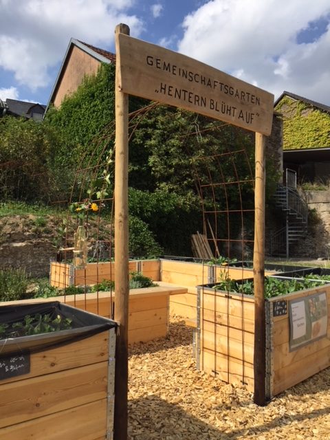 Bei der gemeinsamen Arbeit auf den Blühflächen entstand die Idee, einen Gemeinschaftsgarten direkt neben die Blühfläche in der Ortsmitte anzulegen. 170 Arbeitsstunden und 8 gemeinsame Arbeitseinsätze später, standen binnen weniger als drei Wochen die Hochbeete fix und fertig aufgebaut, ausgelegt mit Kaninchendraht und Folie und befüllt mit dicken und dünnen Ästen, Grasschnitt, Pferdemist, Kompost und Humus. Entstanden sind 12 Hochbeete, die drei Kräuterbeete umschließen. Daneben gibt es ein eigenes Beet für Kinder.