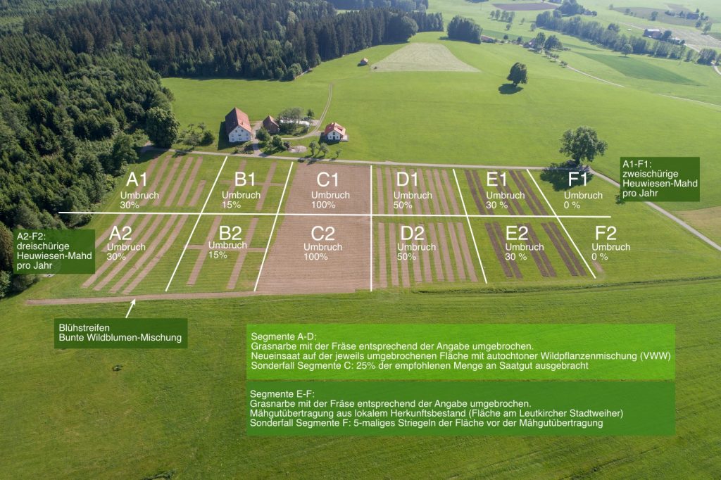 Der Versuch findet auf einer fast viereckigen Fläche von 3,3 ha Grünland nahe Leutkirch-Balterazhofen statt. In den letzten Jahren wurde die Wiese intensiv mit sechs Mähintervallen pro Jahr plus mehrmaliger Düngergabe (v.a. Gülle) bewirtschaftet.