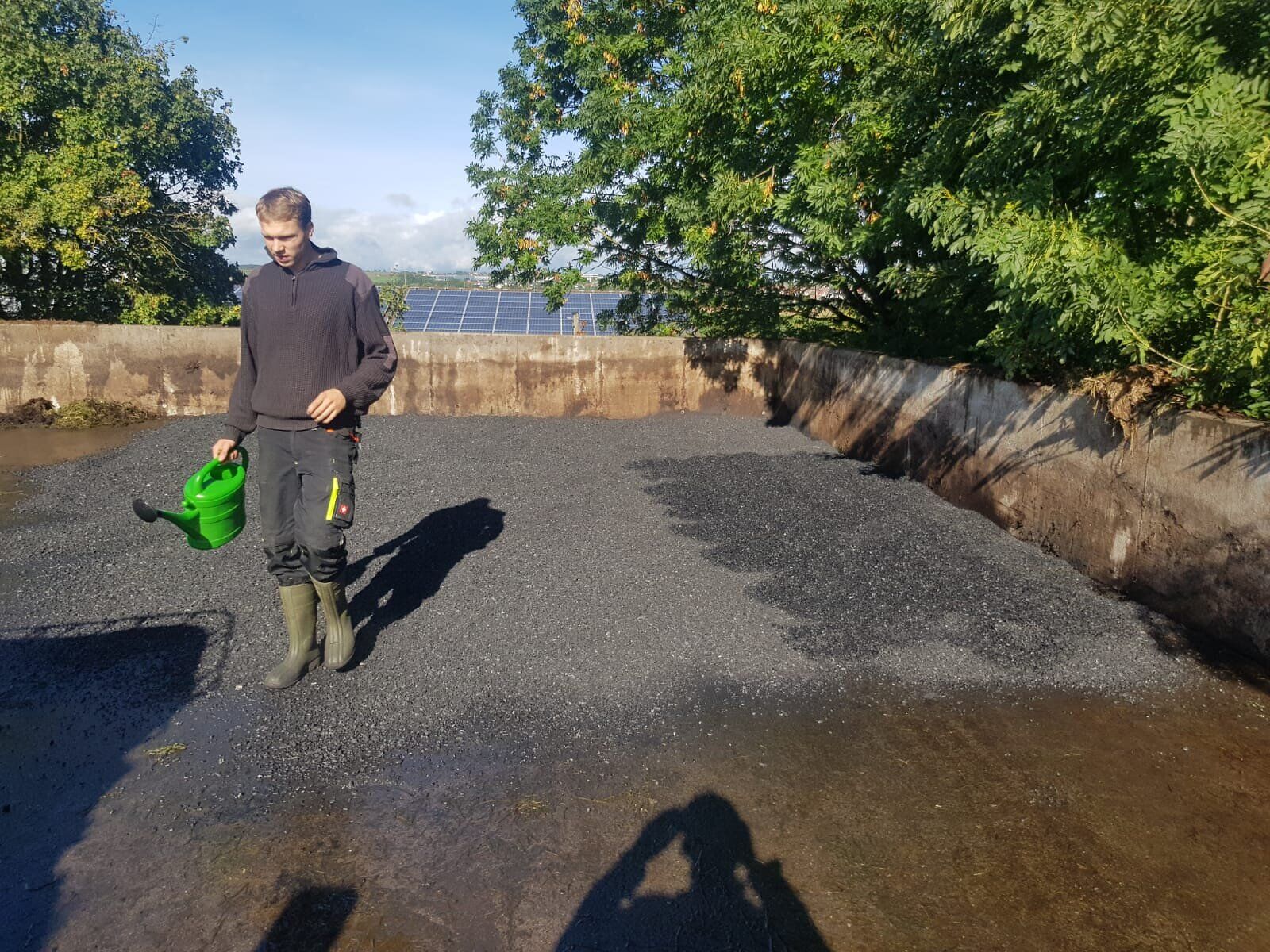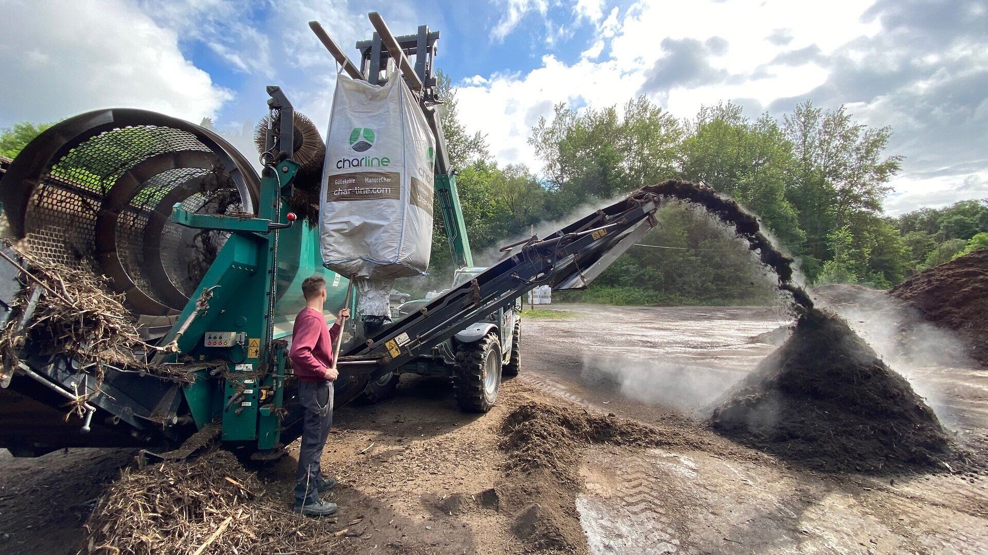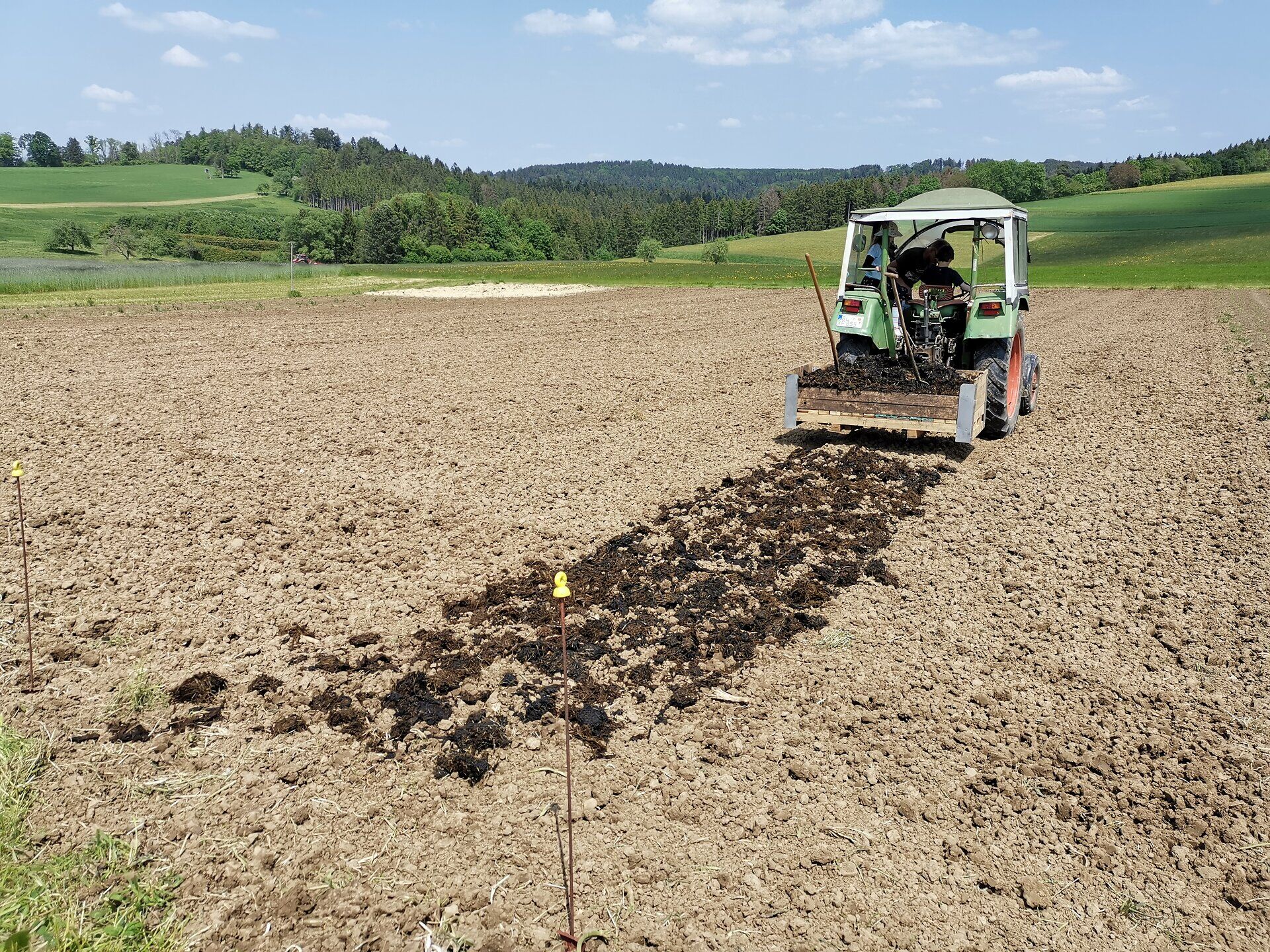 Grünschnittkompost des Hofes in 88682 Salem wurde über die Kompostsiebanlage mit Pflanzenkohle gleichmäßig gemischt, separat gelagert und in einer Grünschnittsammelstelle kompostiert. Später erfolgte die Ausbringung des Reifekompost-Pflanzenkohlegemisches auf eine Parzelle zur Aussaat von Kleegras. Die über das Pflanzenkohle-Kompostgemisch gebundenen Nährstoffe bleiben in den Böden in Reichweite der Wurzeln und werden weniger in die Umgebung ausgewaschen.