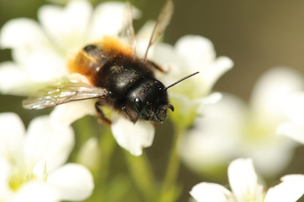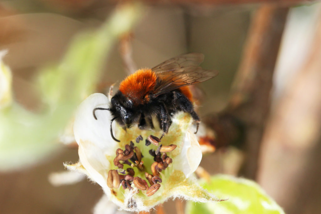 Die Gehörnte Mauerbiene ist eine häufig bei uns vorkommende Wildbiene, die bereits seit Ende Februar unterwegs ist und die ihr bis Anfang Juni entdecken könnt. Sie ist kein besonderer Feinschmecker, also nicht auf eine bestimmte Blütenart spezialisiert.